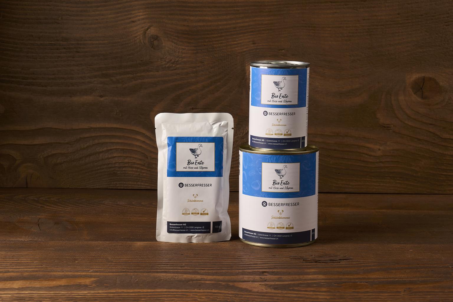 Bio Entenfleisch 60%, Trinkwasser 13%, Bio Hirse 5%, Bio Entenherzen 4%, Bio Entenleber 4%, Bio Entenhälse 4%, Bio Gänseschmalz 3.5%, Bio Entenkarkassen 3%, Bio Mango 3%, Bio Majoran