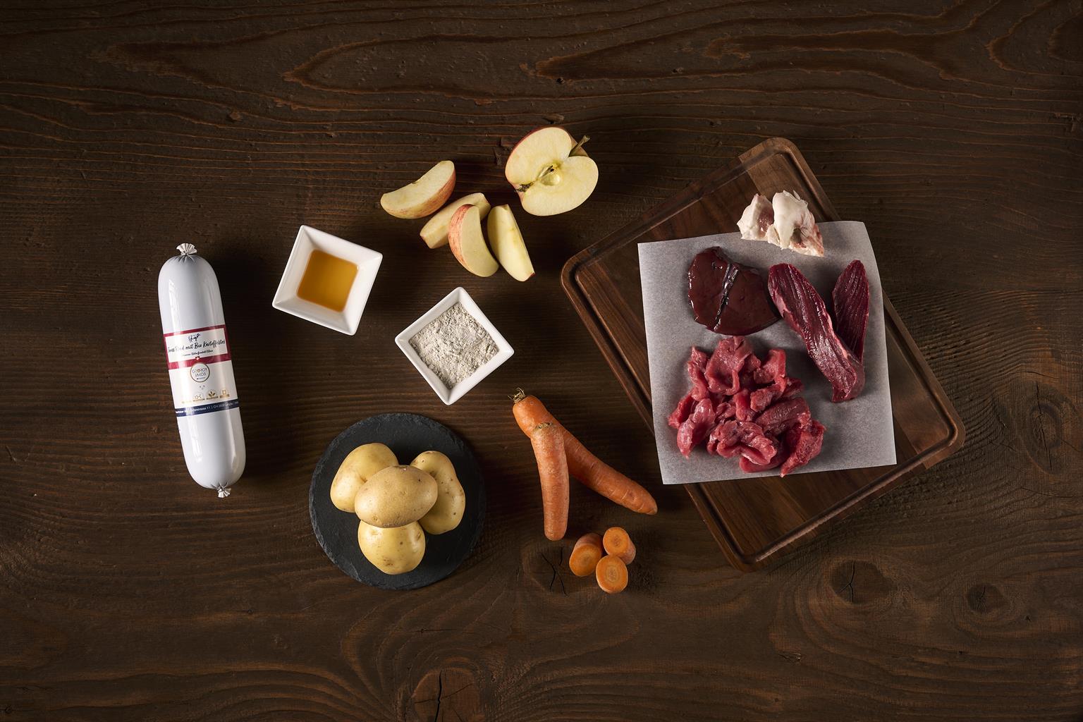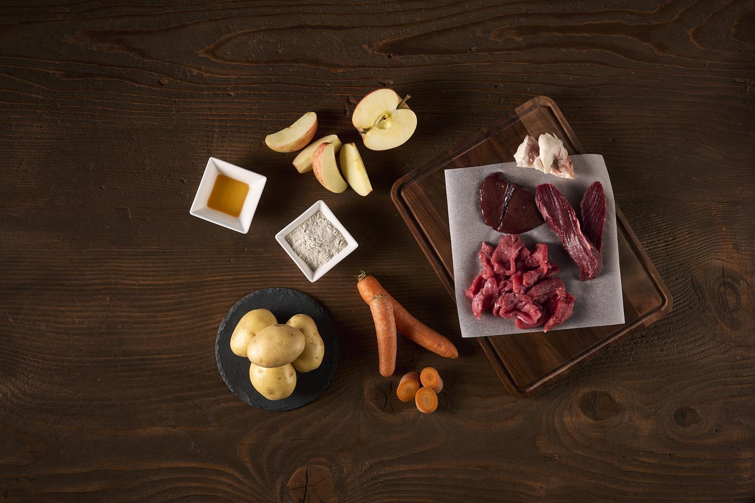 Viande musculaire de bœuf CH 71 %, carottes bio 18,4 %, eau potable 5 %, pommes de terre bio 4 %, calcaire d'algues 0,5 %, topinambour bio, enveloppes de psyllium bio, cynorrhodon bio, berbérine, propolis